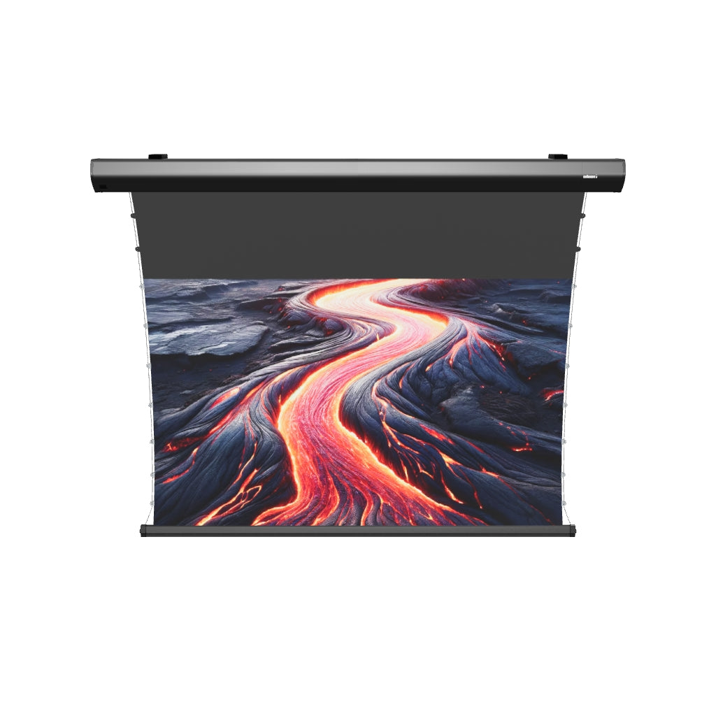 Die Montage ist dank des neu entwickelten, werkzeuglosen Keder-Spannsystems und des anpassbaren Schienensystems einfach und erfordert nur einmaliges Bohren. Das Ergebnis ist eine stets perfekt gespannte Leinwand mit 221,5 x 124,5 cm sichtbarem Bereich und einem schlanken, matt-schwarzen Rahmen, die auch für Ultra-Kurzdistanz-Projektoren optimiert ist.