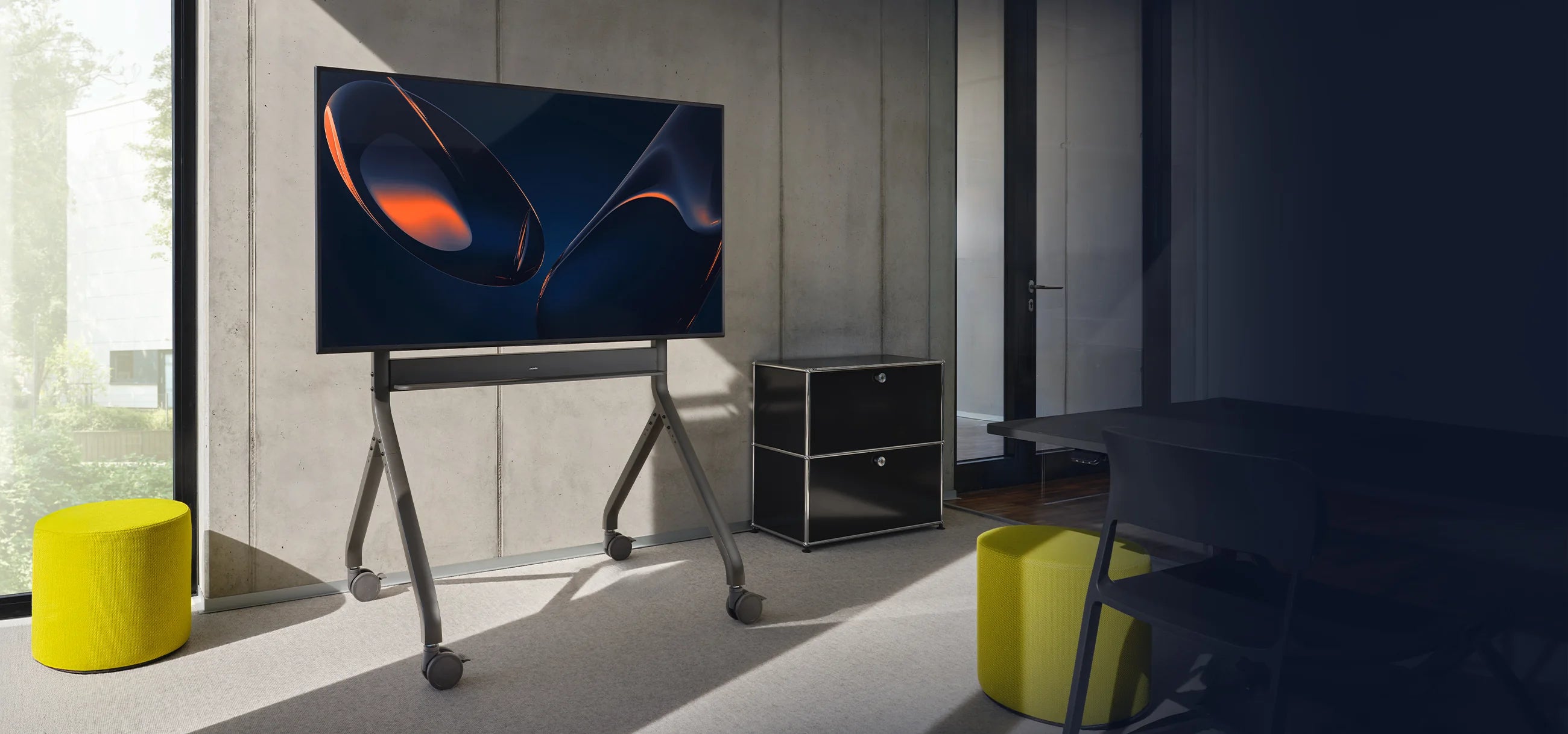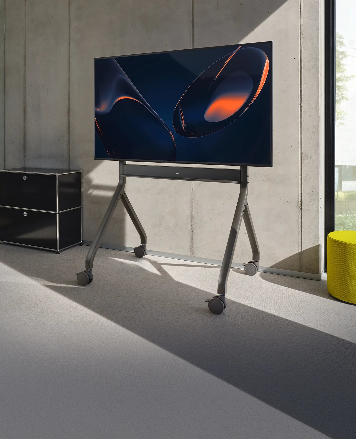 Dank vier leichtgängiger, arretierbarer Rollen lässt sich der Oslo mühelos bewegen und flexibel in unterschiedlichen Räumen einsetzen. Die Feststellfunktion sorgt dafür, dass der Wagen sicher an Ort und Stelle bleibt und unbeabsichtigte Bewegungen verhindert werden. Dies garantiert eine hohe Standstabilität – selbst bei der Nutzung mit großen Displays oder interaktiven Touchscreens.