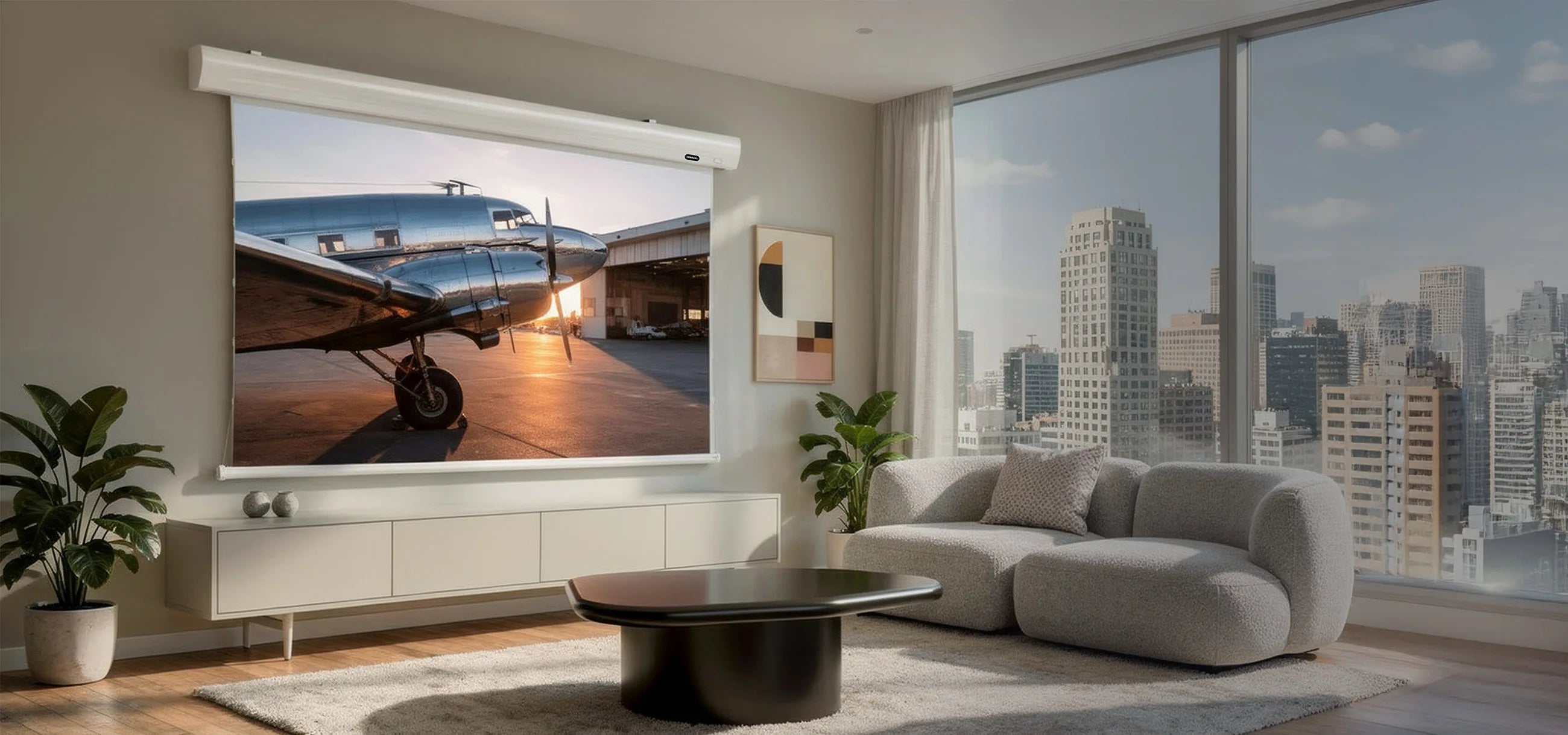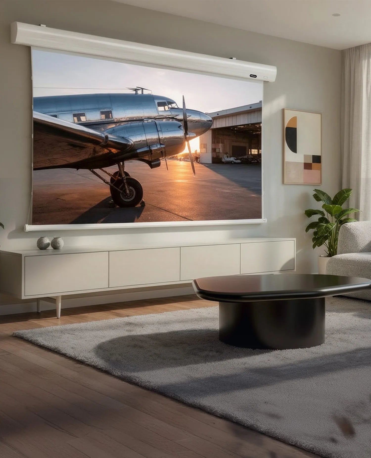 Pantalla tensionada motorizada HomeCinema de celexon - el todoterreno con la tela de pantalla Dynamic Slate ALR.