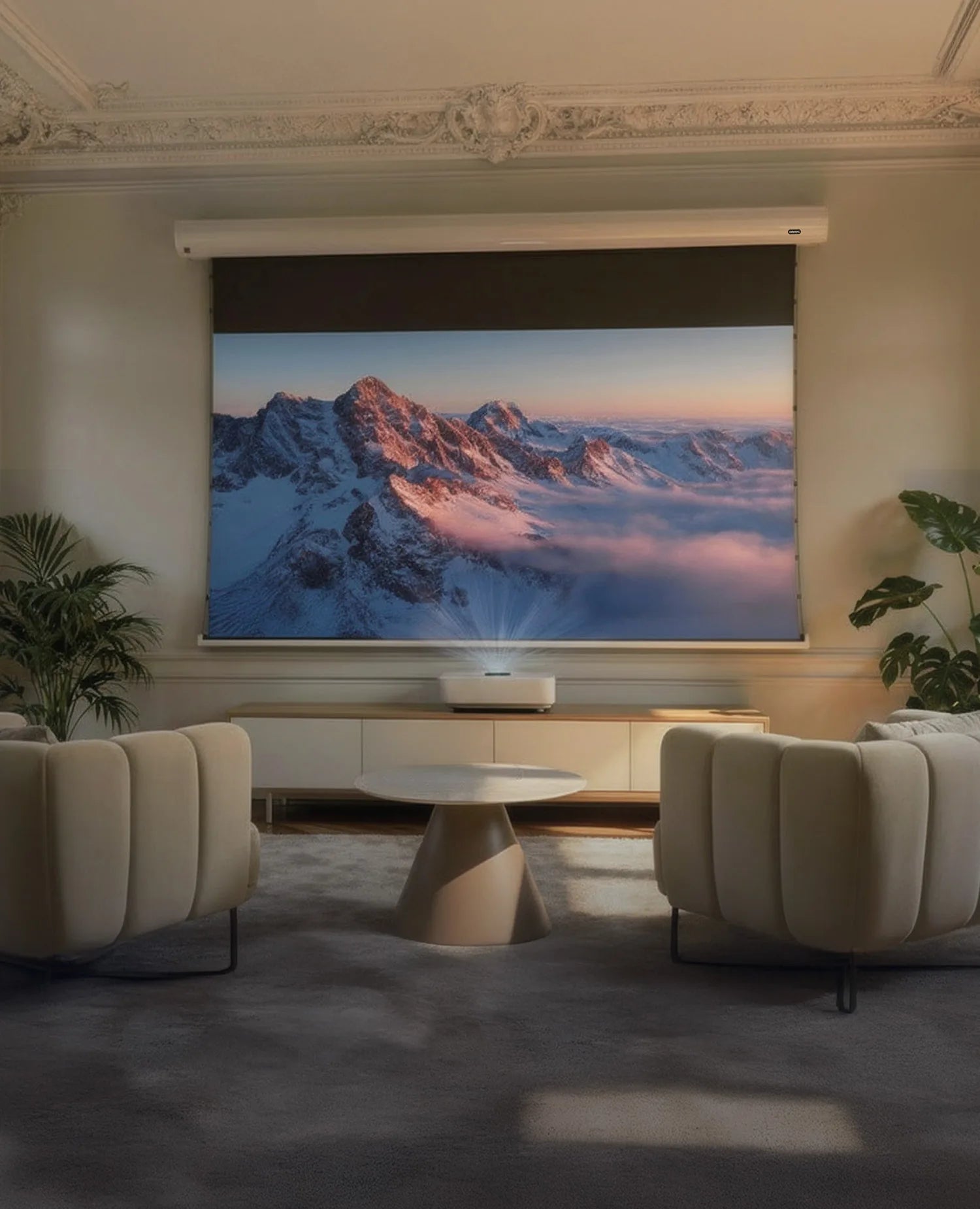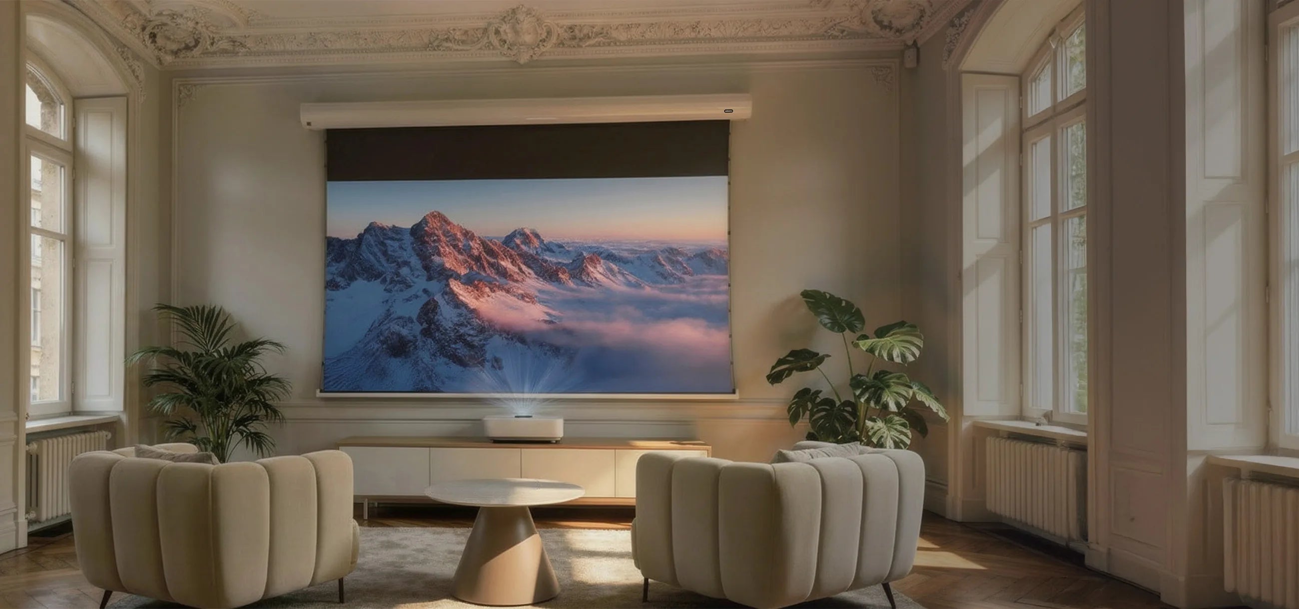 En combinación con un moderno proyector de ultracorta distancia, se convierte en un verdadero televisor láser y, por lo tanto, en una alternativa para los televisores clásicos de mayor tamaño, que pueden perturbar visiblemente el diseño de su interior cuando no se utilizan.