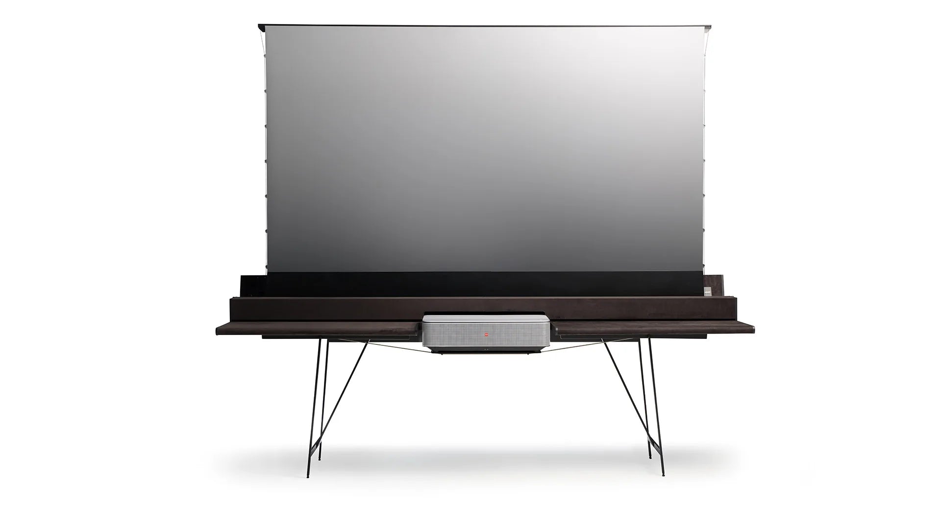 L’un des détails les plus impressionnants de cette solution home cinéma est l’écran intégré, qui disparaît de manière invisible à l’intérieur du meuble. D’une simple pression sur un bouton, il se déploie en douceur – puis se rétracte tout aussi rapidement lorsqu’il n’est plus utilisé.