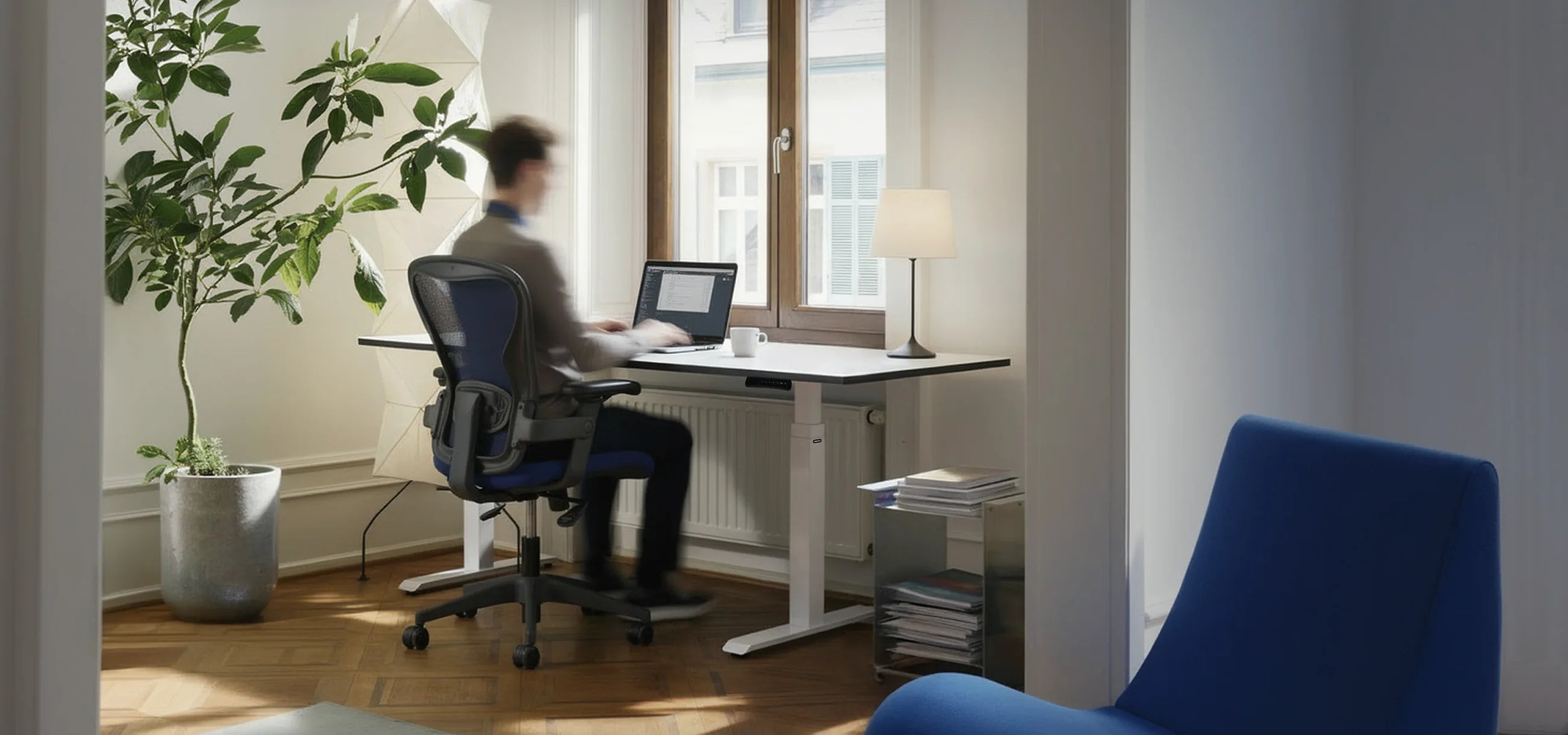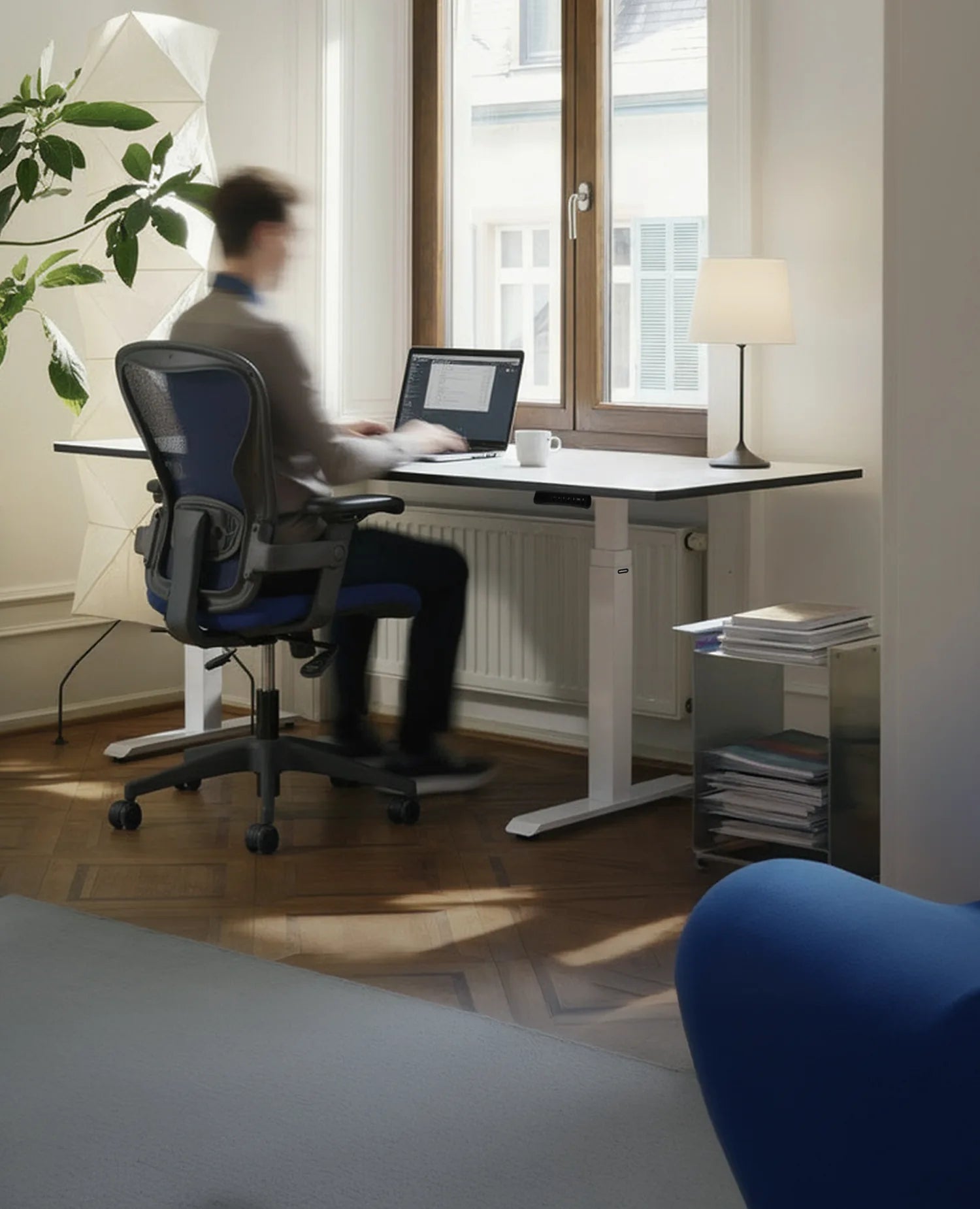 Le double moteur, qui est intégré dans les deux colonnes du pied pour gagner de l'espace, est particulièrement souple et silencieux. Le mécanisme de démarrage et d'arrêt en douceur empêche les arrêts et les démarrages brusques, de sorte que rien sur le bureau ne bascule ou n'oscille.