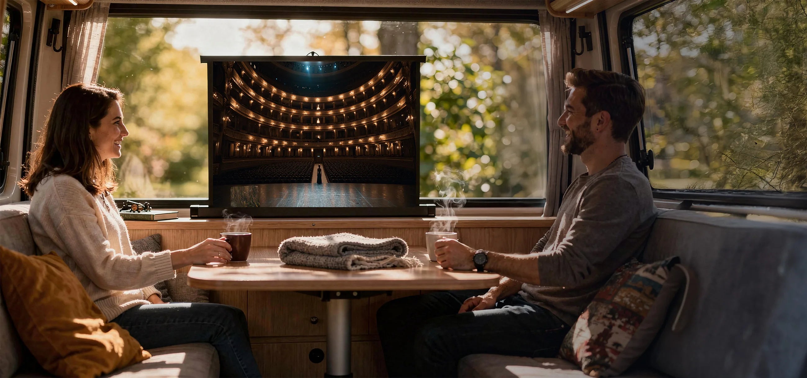 Placés à seulement 10 à 50 cm de l’écran. Ils projettent l’image sous un angle extrêmement faible depuis le bas directement sur l’écran.