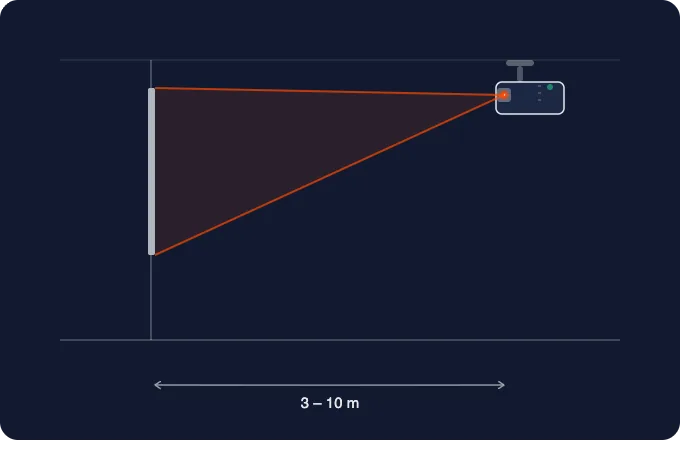 Projektory long-throw rzutują obraz z większej odległości i są często instalowane na suficie lub dalej w pomieszczeniu. Są szczególnie popularne w salach konferencyjnych, klasach lub klasycznych konfiguracjach kina domowego. Większość standardowych ekranów projekcyjnych z matową białą powierzchnią nadaje się do tego typu projekcji.