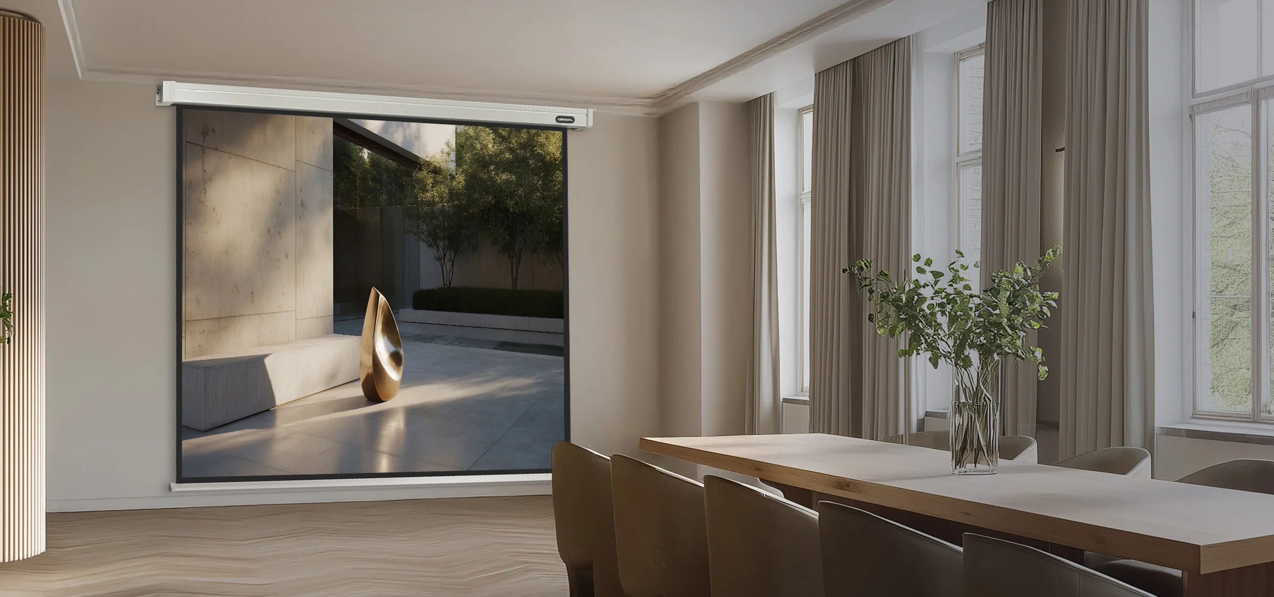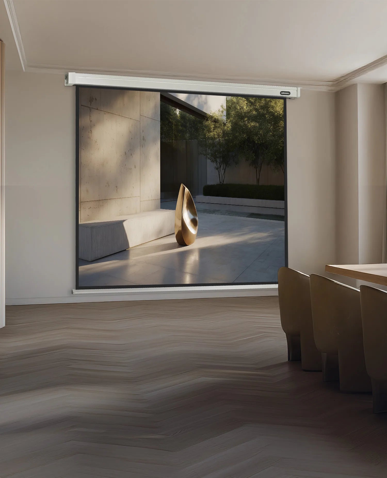 Die Leinwand wird mit einem geräuscharmen Motor betrieben. Dank des viereckigen Gehäuses ist die Leinwand sowohl perfekt für die Wandmontage, als auch für die Deckenmontage geeignet. Der Kabelauslass befindet sich auf der linken Seite, von vorne betrachtet.