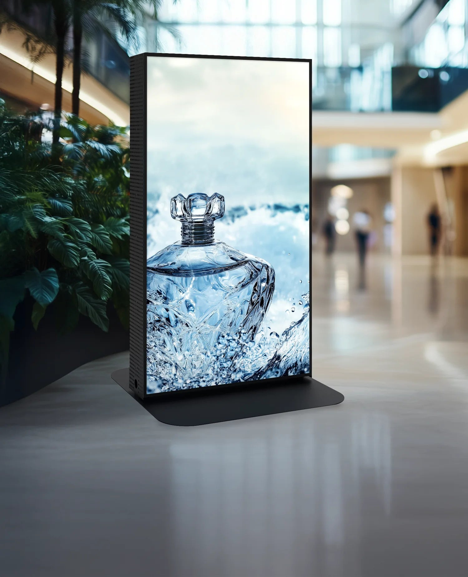 Die celexon Display Stele mit zwei integrierten Sony BRAVIA BZ53L 98" Displays ist die perfekte Lösung für Standorte mit hoher Besucherfrequenz und Sichtachsen aus mehreren Richtungen. Ob in großzügigen Empfangsbereichen, Einkaufszentren, Flughäfen, Messen oder öffentlichen Einrichtungen – dieses System garantiert maximale Sichtbarkeit Ihrer Inhalte auf Vorder- und Rückseite. Die Stele wurde speziell für den professionellen Einsatz konzipiert und vereint ein reduziertes, elegantes Design mit funktionaler Robustheit. Ihr bodentiefes, freistehendes Gehäuse aus pulverbeschichtetem Stahl steht für Langlebigkeit, Stabilität und zeitlose Ästhetik. Beide Displays sind rahmenlos in die Konstruktion integriert – ohne sichtbare Halterungen oder überstehende Elemente – und sorgen so für ein besonders hochwertiges Erscheinungsbild aus allen Blickwinkeln.